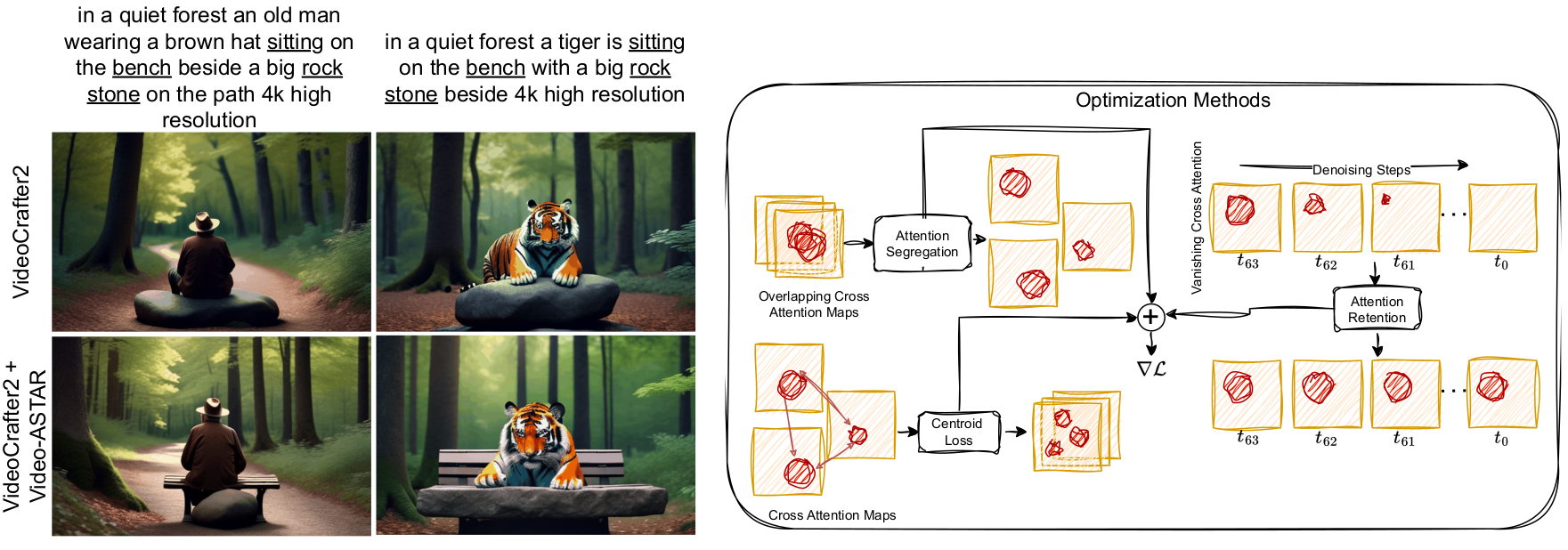Prajwal Singh, Kuldeep Kulkarni, Shanmuganathan Raman, Harsh Rangwani, WACV 2026 project page/ paper This work tackles the challenge of compositional video generation from a text prompt by employing a straightforward, training-free method using a pre-trained video diffusion model. We have introduced Video-ASTAR with centroid loss for the optimization process over the cross-attention map. With comprehensive empirical results and ablation studies, we show its effectiveness over baselines. |